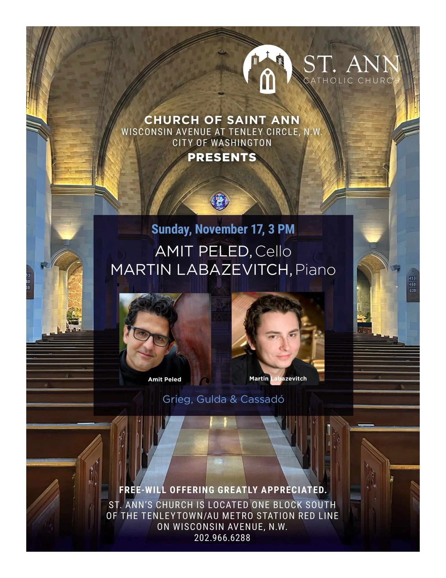 Upcoming Events Nov 8 Recital with Andres Cardenes, violin Saturday, November 8, 2025 7:30 PM 9:00 PM Private Event (map) Google Calendar ICS View Event → Nov 9 Recital with Andrés Cárdenes, violin Sunday, November 9, 2025 3:00 PM 7:00 PM St Ann’s Concert Series (map) Google Calendar ICS View Event → Jan 17 Recital with Amit Peled, cello and Alexander Fiterstein, clarinet Saturday, January 17, 2026 3:00 PM 10:00 PM Private Event (map) Google Calendar ICS More Info + Buy Tickets View Event → Jan 18 Recital with Amit Peled, cello and Alexander Fiterstein, clarinet Sunday, January 18, 2026 3:00 PM 5:00 PM St Ann’s Concert Series (map) Google Calendar ICS View Event → Jan 31 Concerto Performance with Georgetown Chamber Players Saturday, January 31, 2026 7:00 PM 10:00 PM Georgetown Chamber Players (map) Google Calendar ICS View Event → Feb 19 to Feb 21 Amit Peled & Martin Labazevitch Thu, Feb 19, 2026 6:00 PM Sat, Feb 21, 2026 7:00 PM Seattle, WA United States (map) Google Calendar ICS View Event → Feb 22 Amit Peled & Martin Labazevitch Sunday, February 22, 2026 5:00 PM 6:00 PM Grace Episcopal Church (map) Google Calendar ICS View Event → Mar 7 Martin Labazevitch Solo Recital Saturday, March 7, 2026 7:00 PM 10:00 PM Tampa Bay Steinway Gallery (map) Google Calendar ICS View Event → Mar 14 Martin Labazevitch Solo Recital Saturday, March 14, 2026 7:00 PM 8:00 PM Kosciuszko Foundation DC (map) Google Calendar ICS View Event → Mar 25 Amit Peled & Martin Labazevitch Wednesday, March 25, 2026 7:00 PM 10:00 PM Fryderyk Chopin University of Music (map) Google Calendar ICS View Event → Sep 28 Amit Peled & Martin Labazevitch Sunday, September 28, 2025 4:00 PM 8:00 PM Beckwith Recital Hall (map) Google Calendar ICS View Event → Sep 27 Amit Peled & Martin Labazevitch Saturday, September 27, 2025 7:00 PM 8:30 PM First Presbyterian Church (map) Google Calendar ICS View Event → Sep 25 Amit Peled & Martin Labazevitch Thursday, September 25, 2025 6:00 PM 8:00 PM Kosciuszko Foundation (map) Google Calendar ICS View Event → Sep 7 Recital with Magdalena Wór, mezzosoprano Sunday, September 7, 2025 3:00 PM 5:00 PM St Ann’s Concert Series (map) Google Calendar ICS View Event → Sep 6 Recital with Magdalena Wór, mezzosoprano Saturday, September 6, 2025 7:00 PM 8:00 PM Private Event (map) Google Calendar ICS View Event → Aug 29 Amit Peled & Martin Labazevitch Friday, August 29, 2025 4:30 PM 6:30 PM Bethlehem Hebrew Congregation (map) Google Calendar ICS View Event → Aug 27 Amit Peled & Martin Labazevitch Wednesday, August 27, 2025 7:00 PM 8:00 PM Featherstone Center for the Arts (map) Google Calendar ICS View Event → Aug 15 to Aug 19 Rybicki Project with Magdalena Wór, mezzosoprano Fri, Aug 15, 2025 12:00 PM Tue, Aug 19, 2025 10:00 PM Columbus State University (map) Google Calendar ICS View Event → Aug 3 to Aug 9 Teaching Berkshire Piano Academy Sun, Aug 3, 2025 10:00 AM Sat, Aug 9, 2025 11:59 PM Berkshire Piano Academy (map) Google Calendar ICS View Event → Jul 31 Martin Labazevitch Solo Recital for the Washington International Piano Festival Thursday, July 31, 2025 7:30 PM 10:00 PM The Catholic University of America (map) Google Calendar ICS View Event → Jul 26 to Aug 2 Teaching Washington International Piano Festival Sat, Jul 26, 2025 10:00 AM Sat, Aug 2, 2025 10:00 PM The Catholic University of America (map) Google Calendar ICS View Event → Jun 26 Amit Peled & Martin Labazevitch at Music House, Baltimore, MD Thursday, June 26, 2025 8:00 PM 9:00 PM Music House (map) Google Calendar ICS View Event → Jun 23 to Jun 27 Teaching Mason Summer Piano Academy Mon, Jun 23, 2025 7:00 AM Fri, Jun 27, 2025 10:00 PM George Mason Fairfax Campus, de Laski Performing Arts Building (map) Google Calendar ICS View Event → Jun 21 to Jun 27 Teaching PianoFest | Levine Music Sat, Jun 21, 2025 10:00 AM Fri, Jun 27, 2025 10:00 PM Levine Music - MD Campus: Silver Spring (map) Google Calendar ICS View Event → Jun 4 Teaching Celebrate International Children’s Day at the Concert by Young Pianists – Students of Dr. Martin Labazevitch Wednesday, June 4, 2025 7:00 PM 10:00 PM Kosciuszko Foundation (map) Google Calendar ICS View Event → Jun 2 Amit Peled & Martin Labazevitch | WTA live recording Monday, June 2, 2025 7:00 PM 8:00 PM Downtown Piano Works (map) Google Calendar ICS View Event → Jun 2 Teaching Celebrate International Children’s Day at the Concert by Young Pianists – Students of Dr. Martin Labazevitch Monday, June 2, 2025 3:00 PM 6:00 PM Kosciuszko Foundation (map) Google Calendar ICS View Event → May 31 Amit Peled & Martin Labazevitch at An Die Musik Live Saturday, May 31, 2025 8:00 PM 9:00 PM An Die Musik Live (map) Google Calendar ICS View Event → Apr 15 Solo Performance for the Johns Hopkins Science Diplomacy Summit Tuesday, April 15, 2025 4:00 PM 10:00 PM Johns Hopkins University Bloomberg Center (map) Google Calendar ICS View Event → Apr 11 Solo and Art Song Performance for the Russian Chamber Art Society Friday, April 11, 2025 7:00 PM 10:00 PM La Maison Française (map) Google Calendar ICS View Event → Mar 2 Performance at Music Arts International Sunday, March 2, 2025 3:00 PM 5:00 PM Calvary Lutheran Church (map) Google Calendar ICS View Event → Feb 28 Solo Performance for the Mason Summer Academy Friday, February 28, 2025 7:00 AM 10:00 PM United Christian Parish (map) Google Calendar ICS View Event → Feb 14 Performance with Brian Ganz, piano Friday, February 14, 2025 6:30 PM 9:30 PM Kosciuszko Foundation (map) Google Calendar ICS View Event → Feb 5 Performance with Mount Vernon Virtuosi Quartet Wednesday, February 5, 2025 6:30 PM 9:30 PM Kosciuszko Foundation (map) Google Calendar ICS View Event → Jan 19 A Concert Tribute to Nina Svetlanova Sunday, January 19, 2025 12:00 PM 1:00 PM Manhattan School of Music, Greenfield Hall (map) Google Calendar ICS View Event → Nov 17 Amit Peled & Martin Labazevitch Sunday, November 17, 2024 3:00 PM 5:00 PM 
