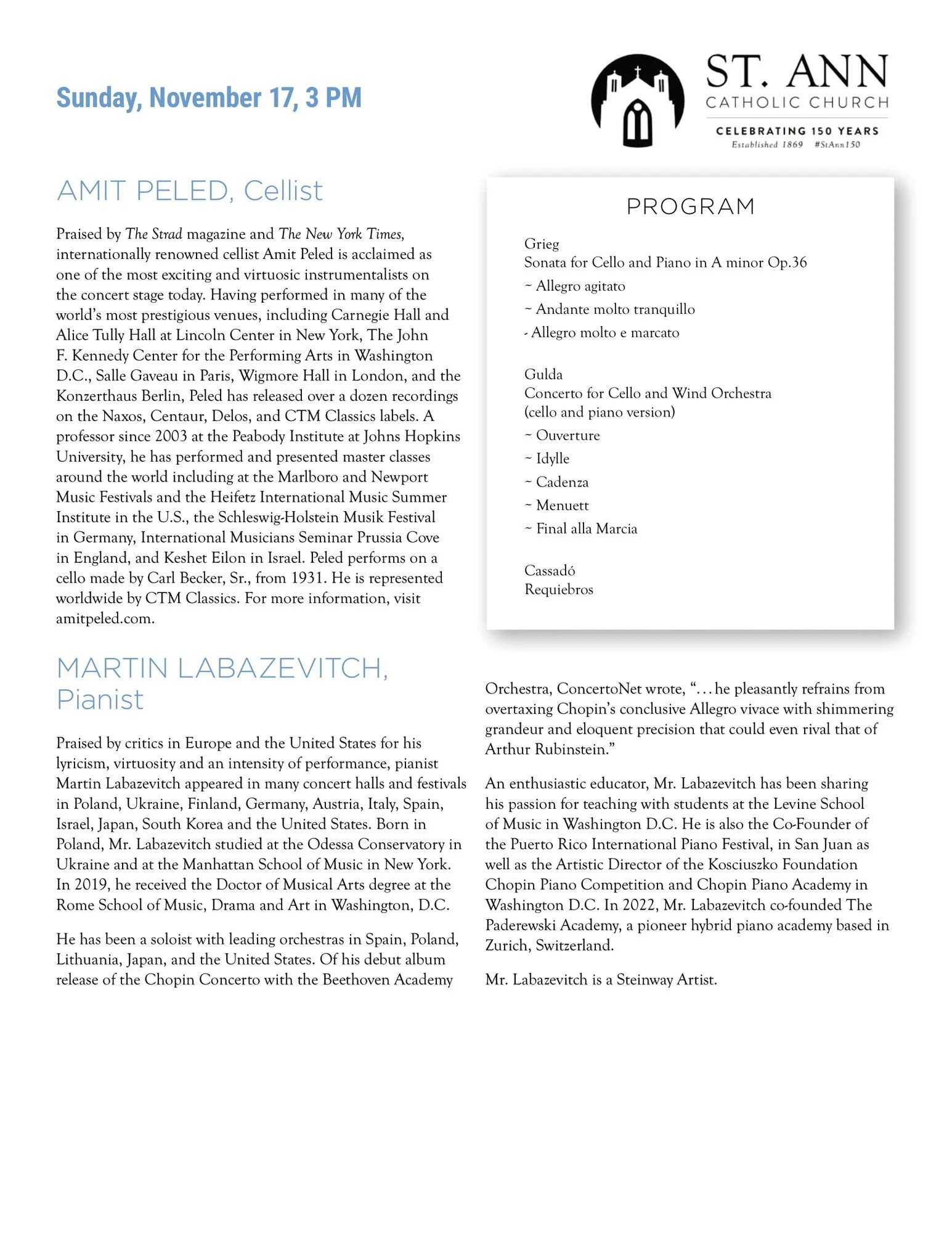 Amit Peled & Martin Labazevitch Sunday, November 17, 2024 3:00 PM 5:00 PM St Ann’s Concert Series 4001 Yuma Street NW Washington, DC 20016 United States (map) Google Calendar ICS Buy Tickets View fullsize View fullsize